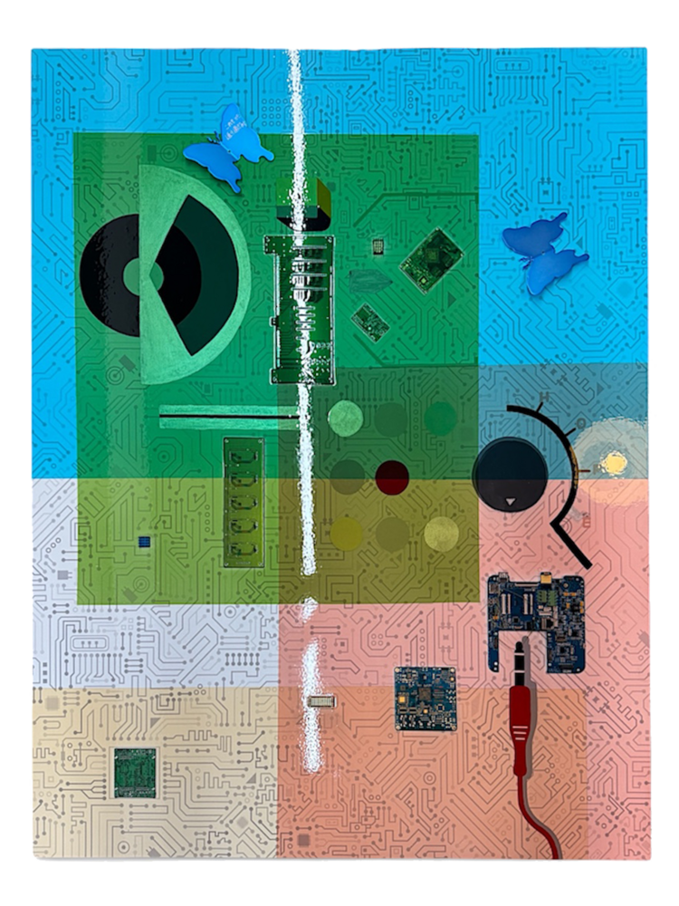 무술년 R, 2021 recycled circuit boards, swarovski stone crystal resin, car painting on board 10.8 x 16 inches, 27.5 x 40.7cm